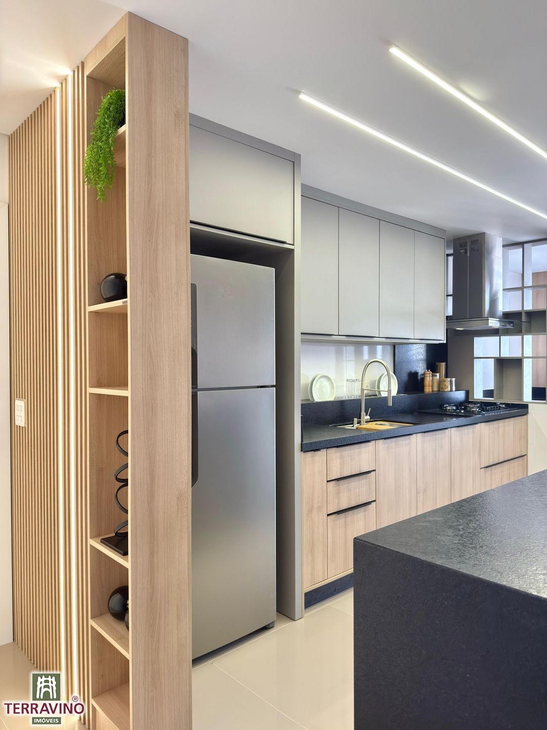 COZINHA; Bancada em Granito São Gabriel Escovado, Eletrodomésticos em Inox Electrolux, Cuba Morgana Tramontina com Calha Úmida, Acabamentos Cromados, Cooktop 5 bocas Coifa de Ilha, Banquetas estofadas, Iluminação Funcional LED