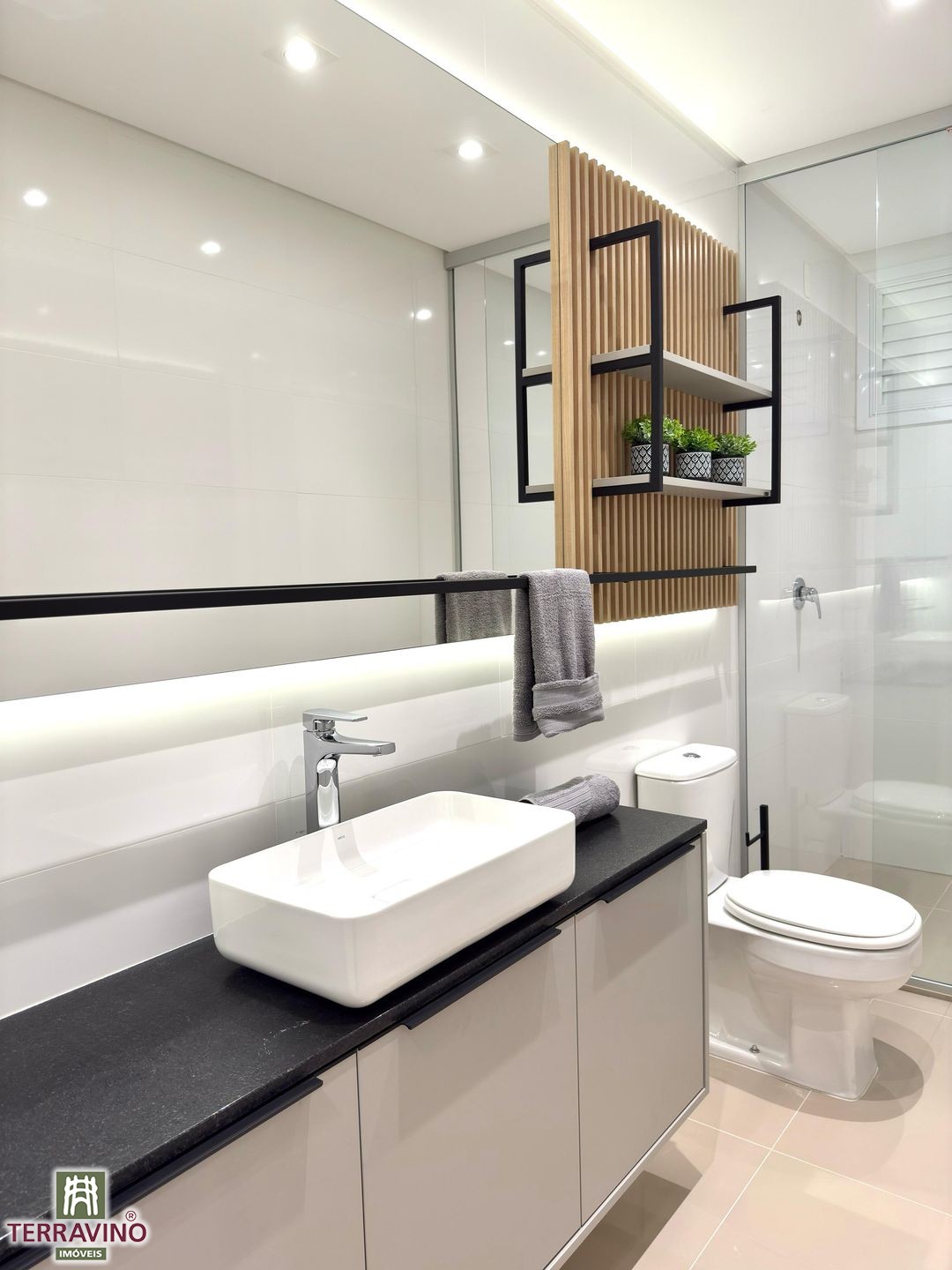 BANHEIRO SOCIAL; Bancada em Granito São Gabriel, Cuba de Apoio Deca, Móvel superior com prateleiras e espelho fixo, Toalheiro em Metalon preto, Acabamentos Cromados, Box até o teto