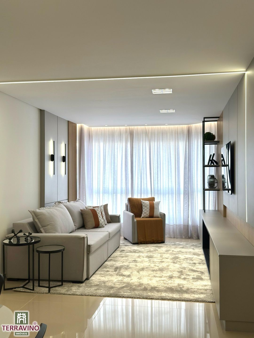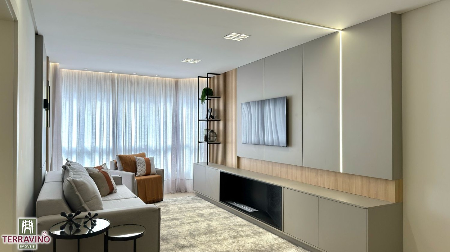SALA DE ESTAR; Sofá em linho, Poltrona, Painel de TV com móvel de apoio, Lareira Ecológica, TV 55’’, Tapete, Cortinas em Linho, Mesinhas de apoio Iluminação aconchegante no cortineiro e painel para assitir um filme em família
