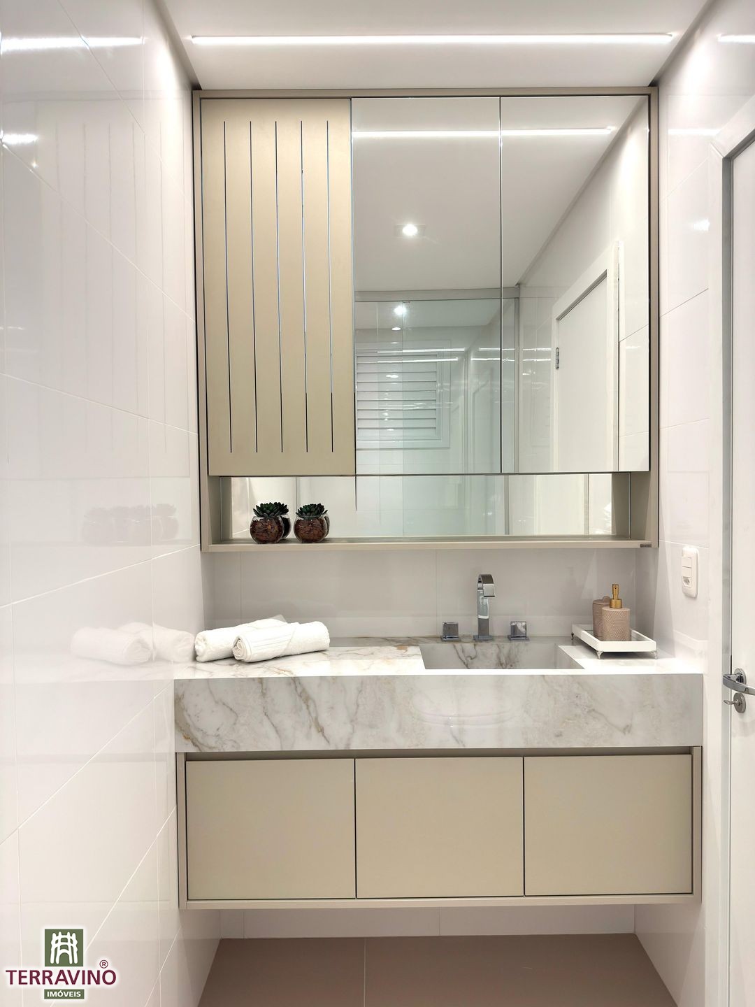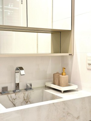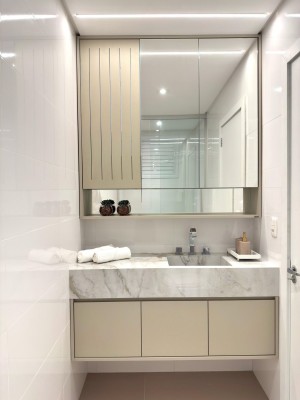 BANHEIRO SUÍTE; Bancada em Porcelanato, Cuba Esculpida, Móvel superior com duas porta de giro espelhadas e porta ventilada, Acabamentos Cromados, Box até o teto
