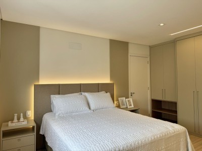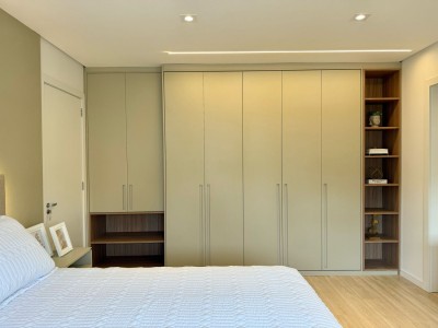 DORMITÓRIO CASAL; Cama de Casal Queen, Cabeceira estofada com iluminação, Armário com sete portas de giro em MDF, Penteadeira com iluminação frontal, Amplo espaço de armazenamento, Iluminação aconchegante.