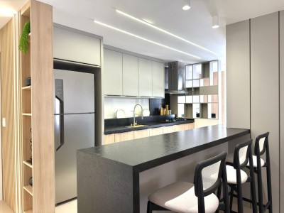 ESPAÇO GOURMET; Banco com iluminação em led, Armário vertical, Futtons em linho, Persiana rolo translúcida. Ideal para receber amigos e familiares em um espaço amplo com churrasqueira.