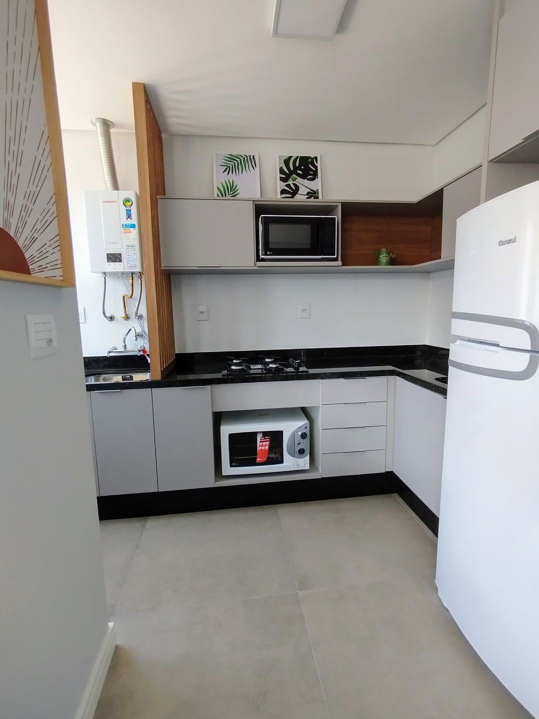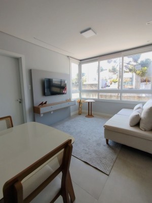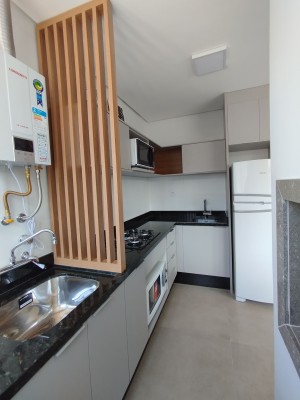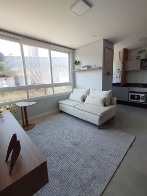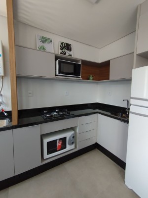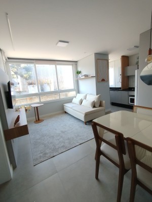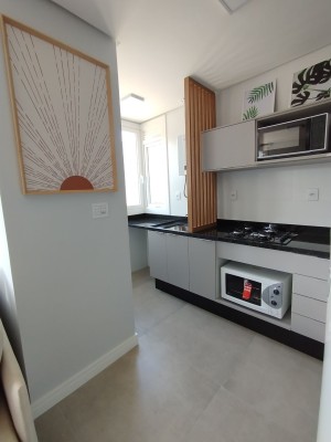Com uma área privativa de 45,09m², com 01 dormitório, sala de estar e jantar integradas, cozinha com móveis planejados e churrasqueira. 01 banheiro social.