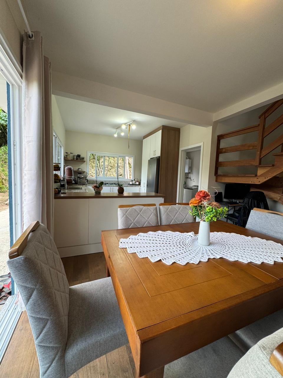 Piso Inferior: Sala de estar, sala de jantar, cozinha, banheiro completo, área de serviço e garagem;