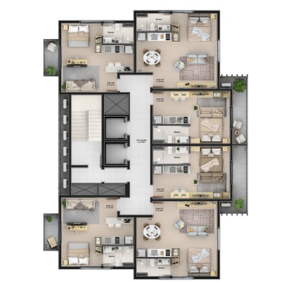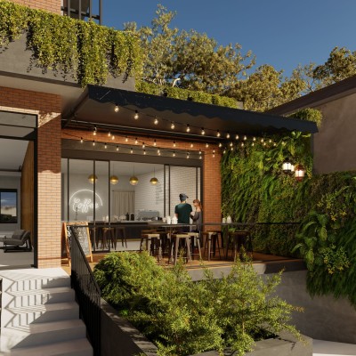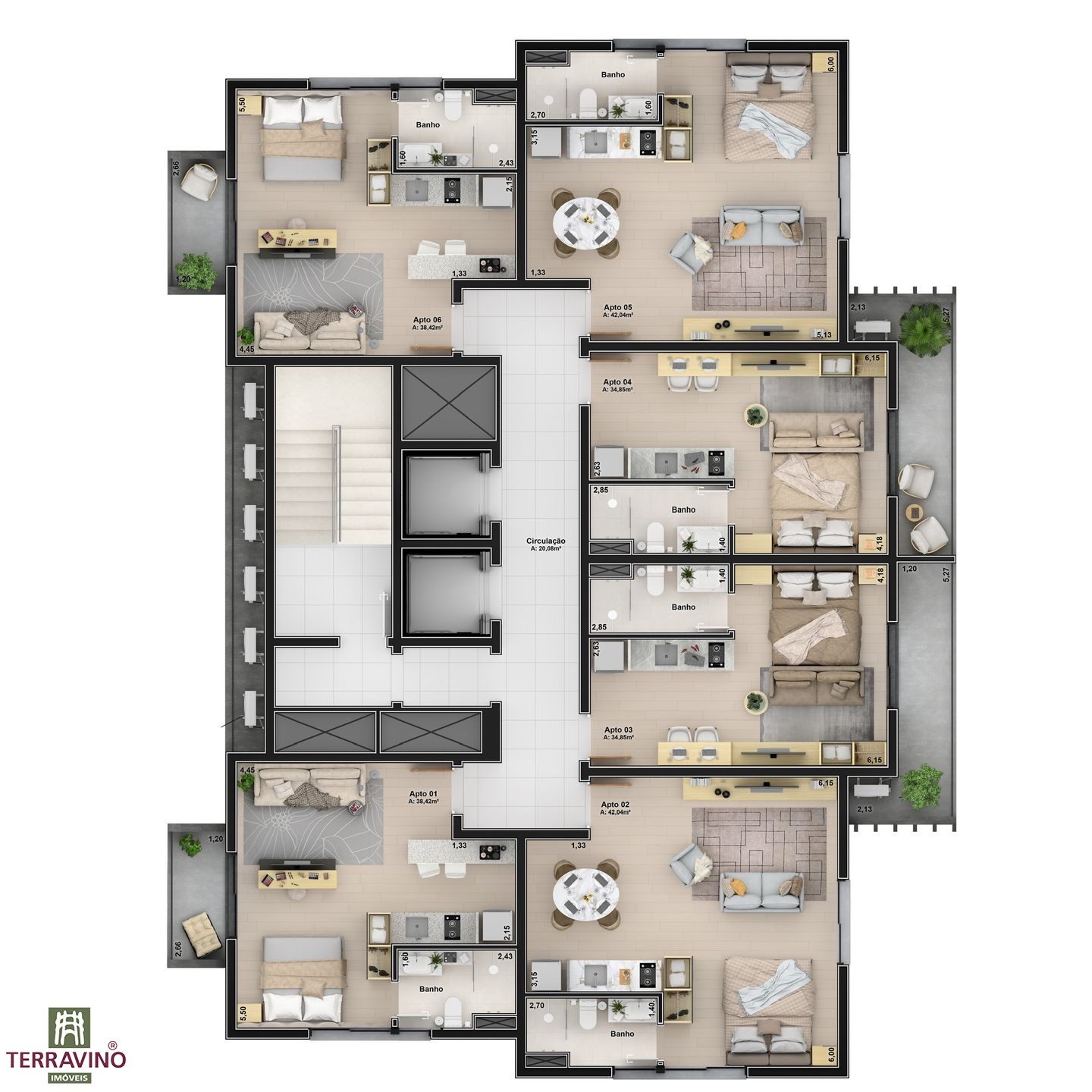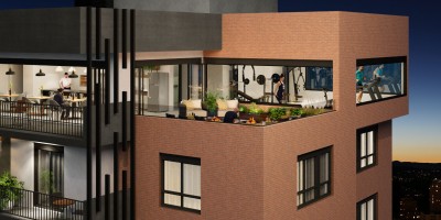 • Térreo multifuncional com cafeteria ampla e deck, recepção com atendimento, lounge de convivência, lavanderia compartilhada, sala de reuniões com biblioteca, coworking, pet place e um terraço com deck coberto e espreguiçadeiras.