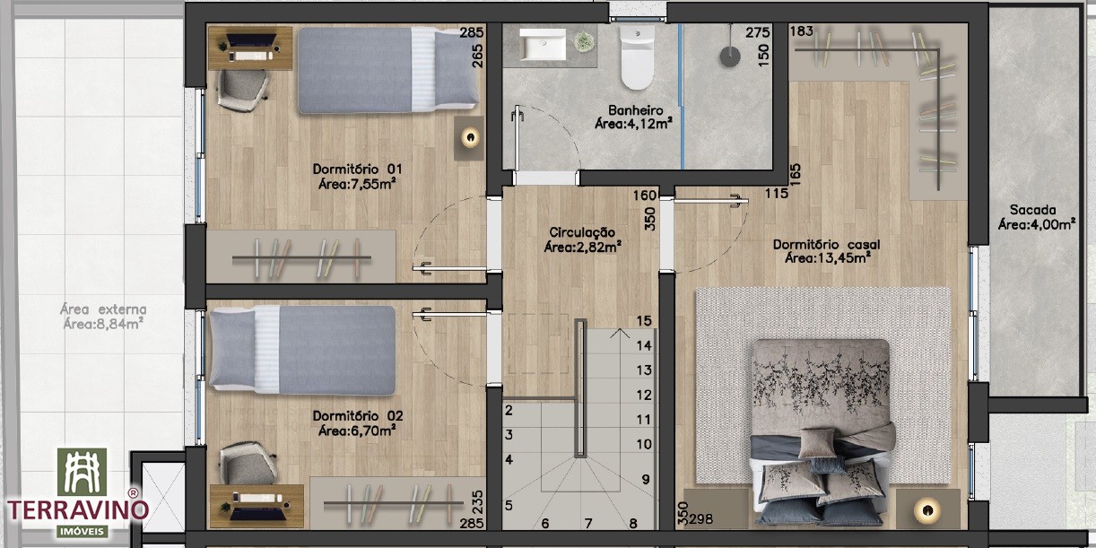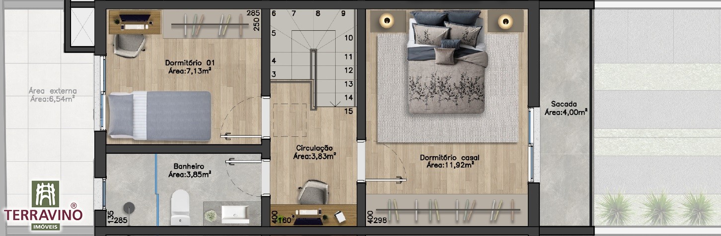 Andar 2: dormitórios, banheiro e sacada no dormitório frente.