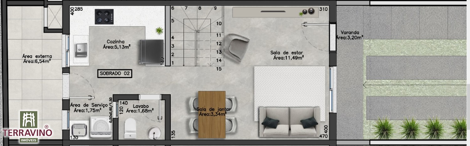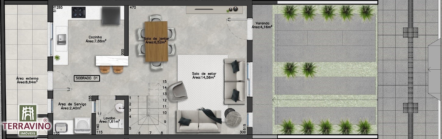 Andar 1: sala de estar, cozinha, lavanderia e lavabo, com área externa nos fundos.
