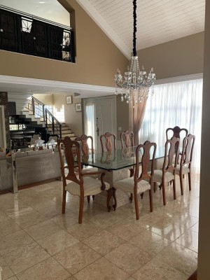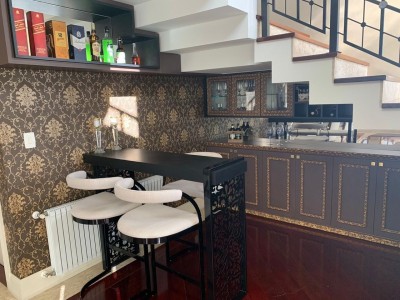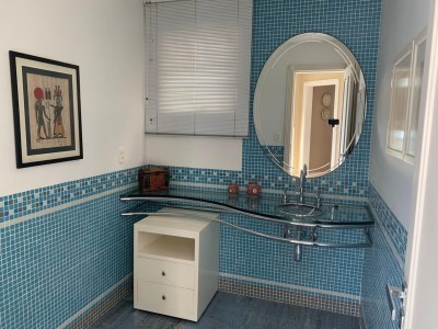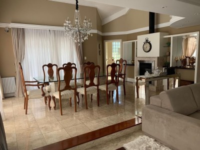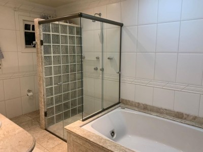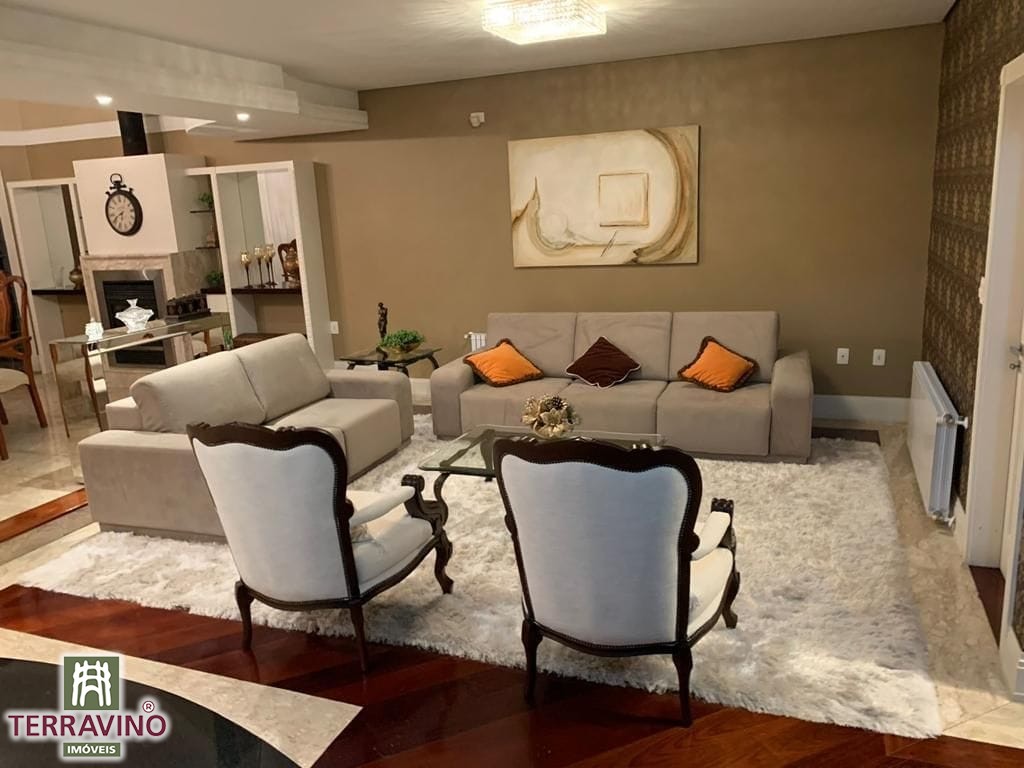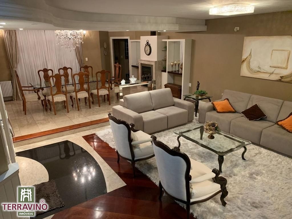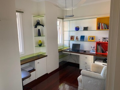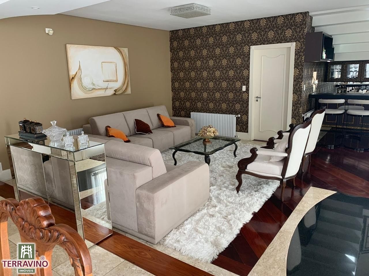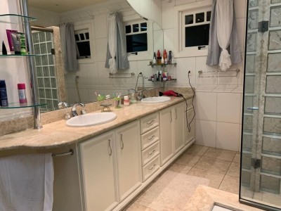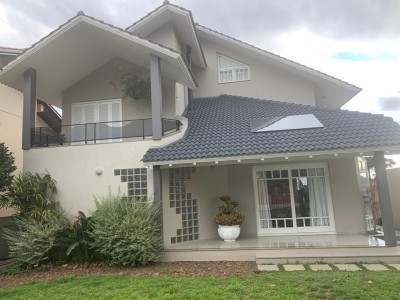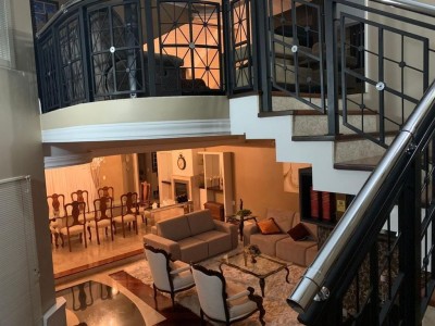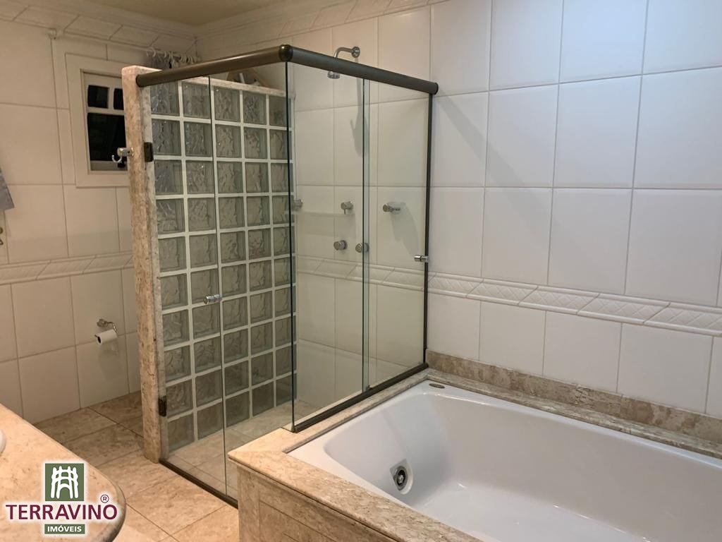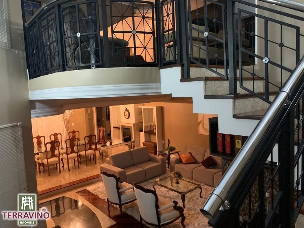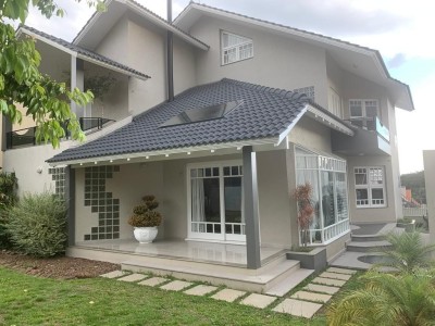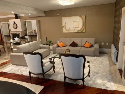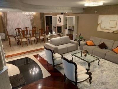 Pavimento Térreo composto por: Sala de estar e jantar com lareira, varanda, lavabo, adega/bar, cozinha, área de serviço, escritório com banheiro, garagem para 04 automóveis com churrasqueira, banheiro e depósito.